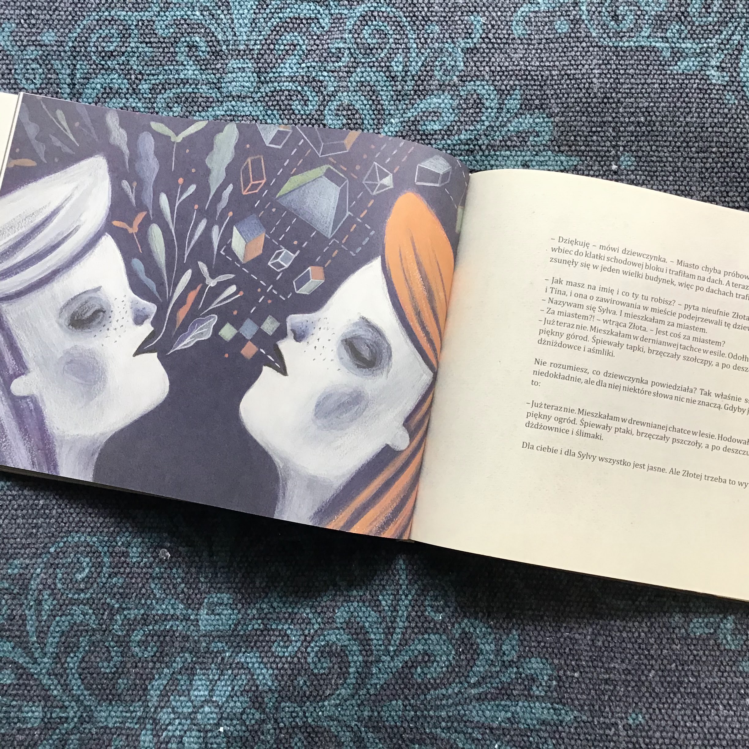 Całość dopełniają mroczne ilustracje Magdy Rucińskiej, dobrze wpasowujące się w z jednej strony baśniowy, z drugiej postapokaliptyczny klimat. Autorka rezygnuje ze szczegółów, detali, widzimy głównie plamy, figury, kształty w różnych odcieniach szarości. Geometryczne bryły po pierwsze przypominają dziecięce klocki, po drugie oddają industrialny, techniczny charakter miasta.